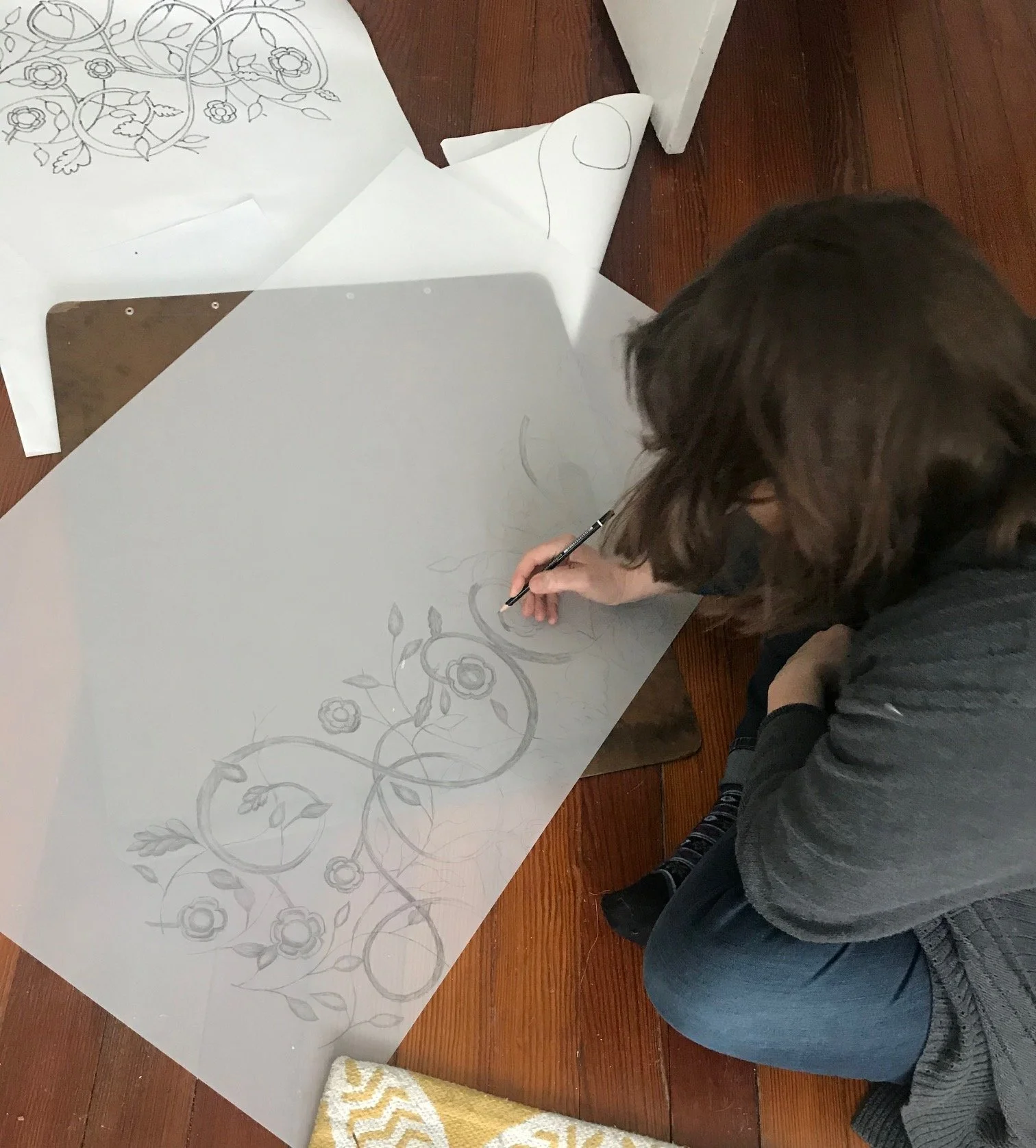Yes, all the layers in my work are made by hand. The photo below provides a glimpse into the process used to make Birds and Bees in the Garden (detail photo above). I start by designing a repeat pattern. This usually starts with a few sketches that I tighten up into a finished drawing for the pattern. You can see the original drawing for this one at the top of the photo. It’s drawn to scale so I can overlay the mylar in order to trace it and place it properly on the page. I went on to add some value to this drawing which is what I’m doing in the photo below.